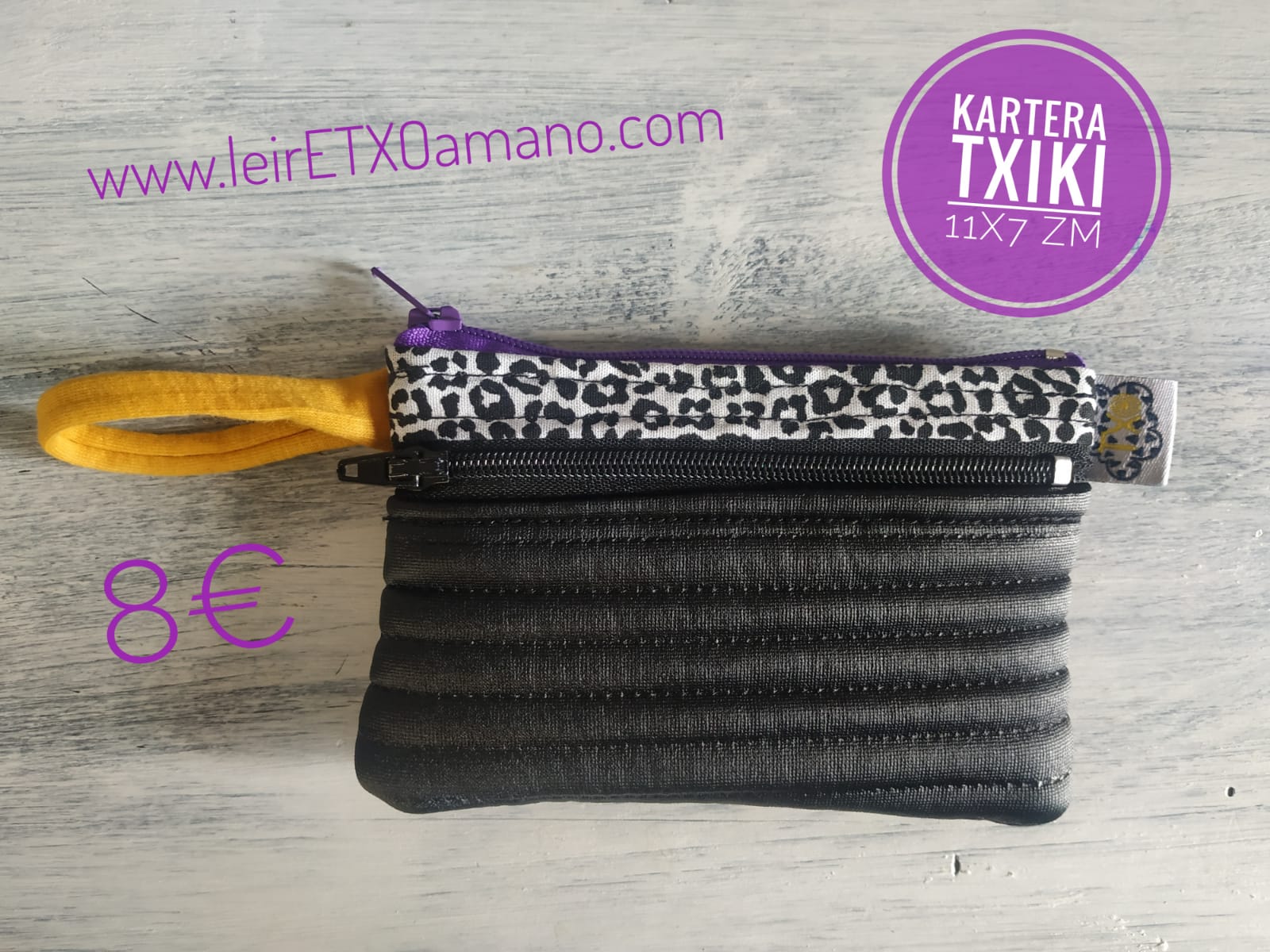 KarTeRa KaRTeRa ‘TXiKi’ (8,00 €) Publicado por leiretxoamano el 28 noviembre, 20202 junio, 2021 Tamaina txikiko diru-zorroa dirua eta txartelak eramateko aproposa, neopreno edo larruantzez egina. / Cartera tamaño pequeño ideal para llevar dinero y tarjetas, hecha con neopreno o polipiel. Neurriak / Medidas: 11zm x 7zm (aprox.)