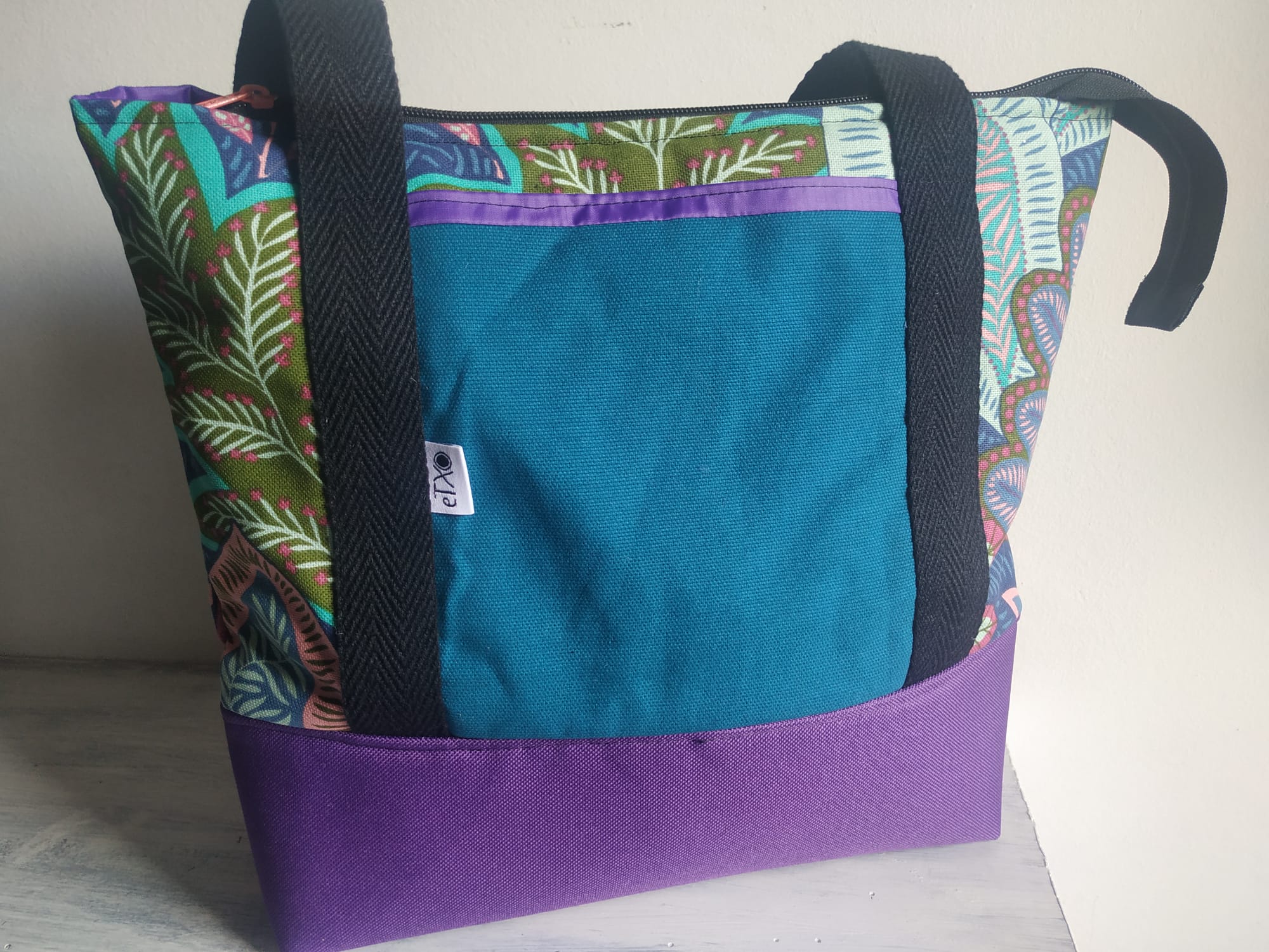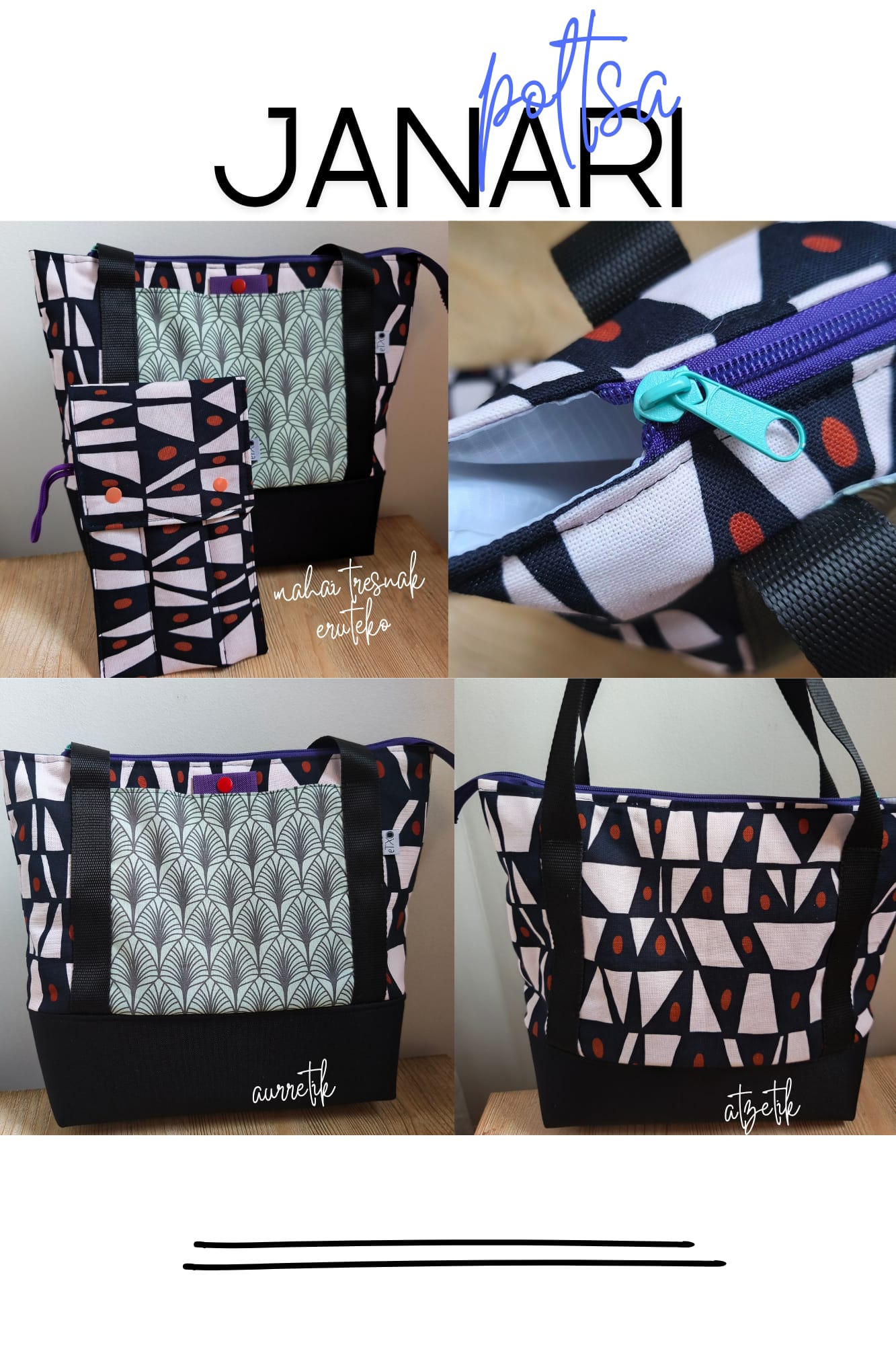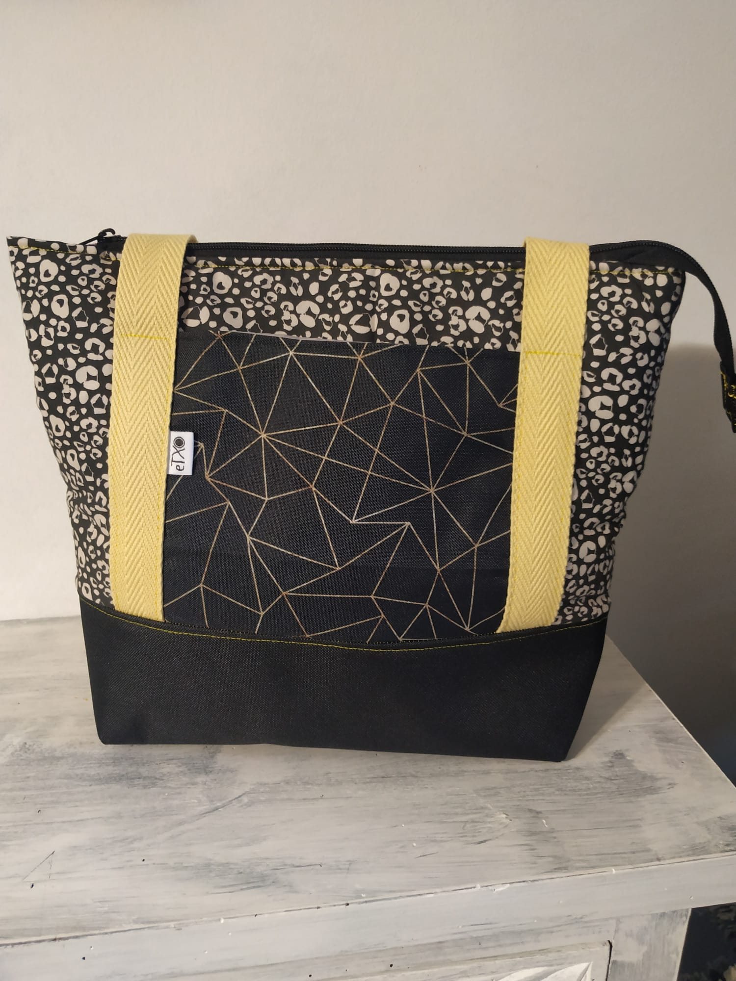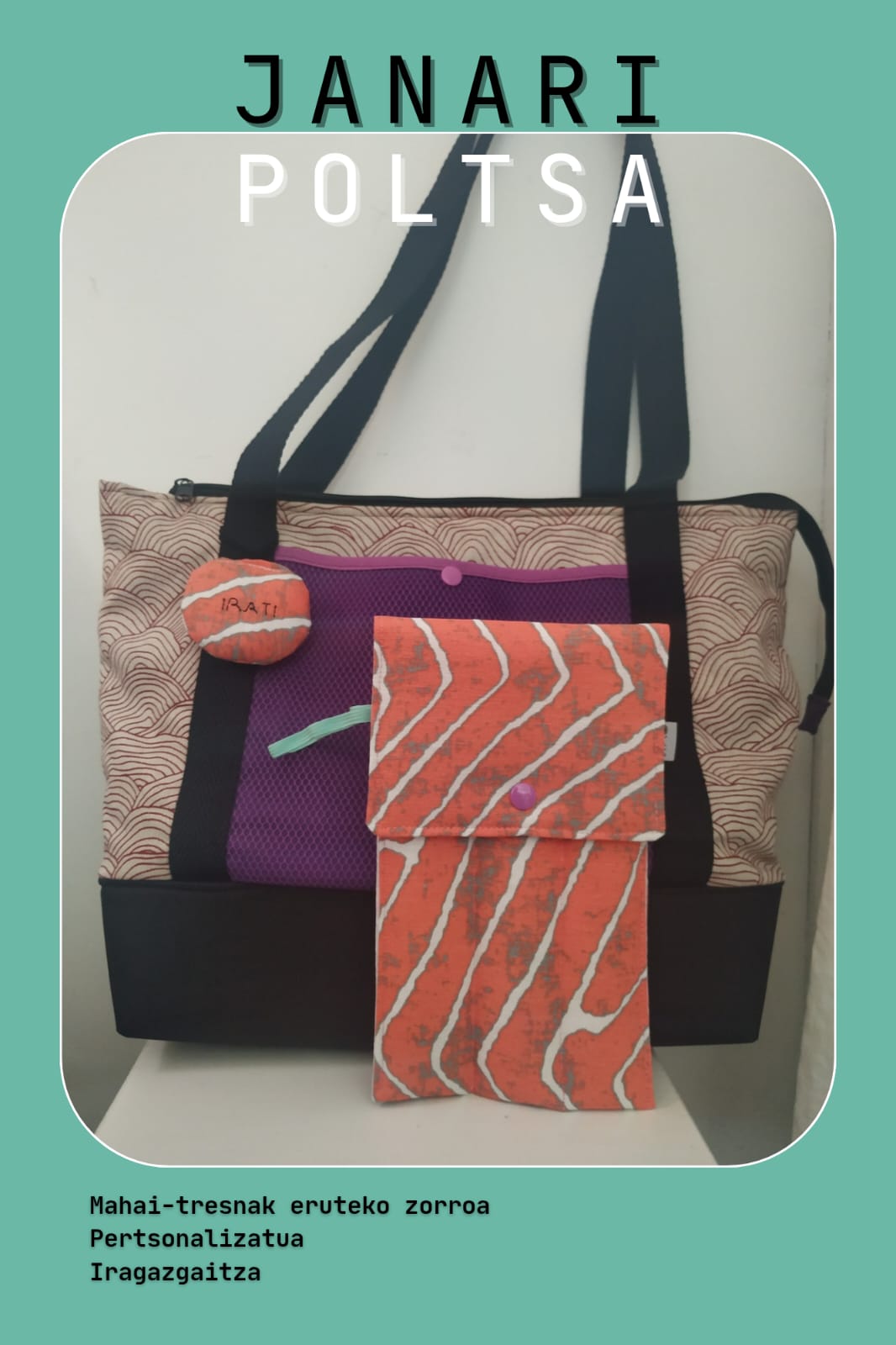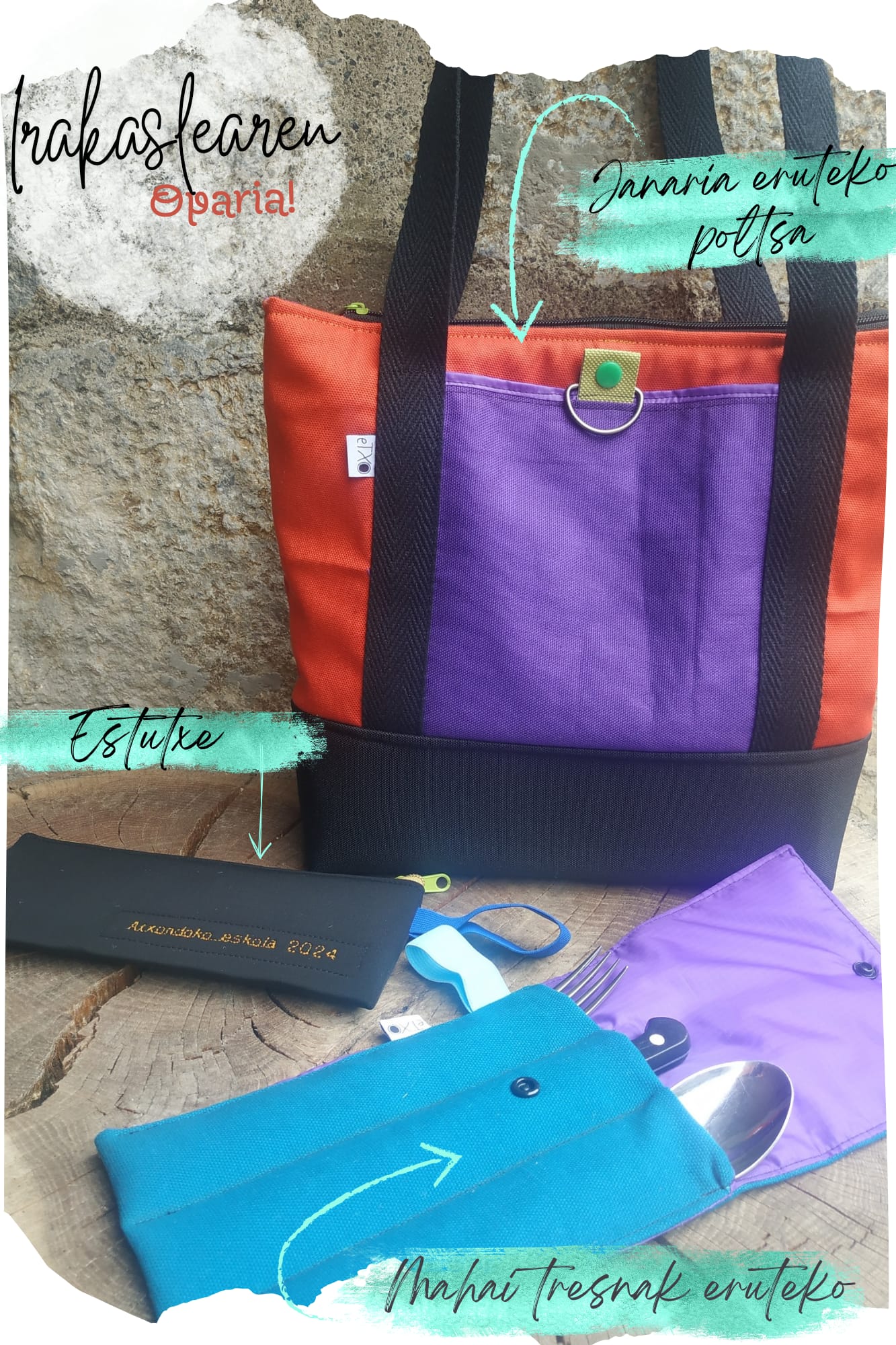 Janaria edo/eta tupperrak eramateko poltsa heldulekuekin, barnea oihal iragazgaitzez egina erraz garbitzeko, azpialdea guata sendoz babestua kristalezko tuperrak arazo gabe eramateko. Kanpo boltsikoa eta sorbaldatik eskegi daiteke. / Bolsa porta comida y/o tuppers con asas, tela interior impermeable para fácil limpieza, base de guata gruesa para poder llevar tupper de cristal con más seguridad. Bolsillo exterior y se puede colgar en el hombro.