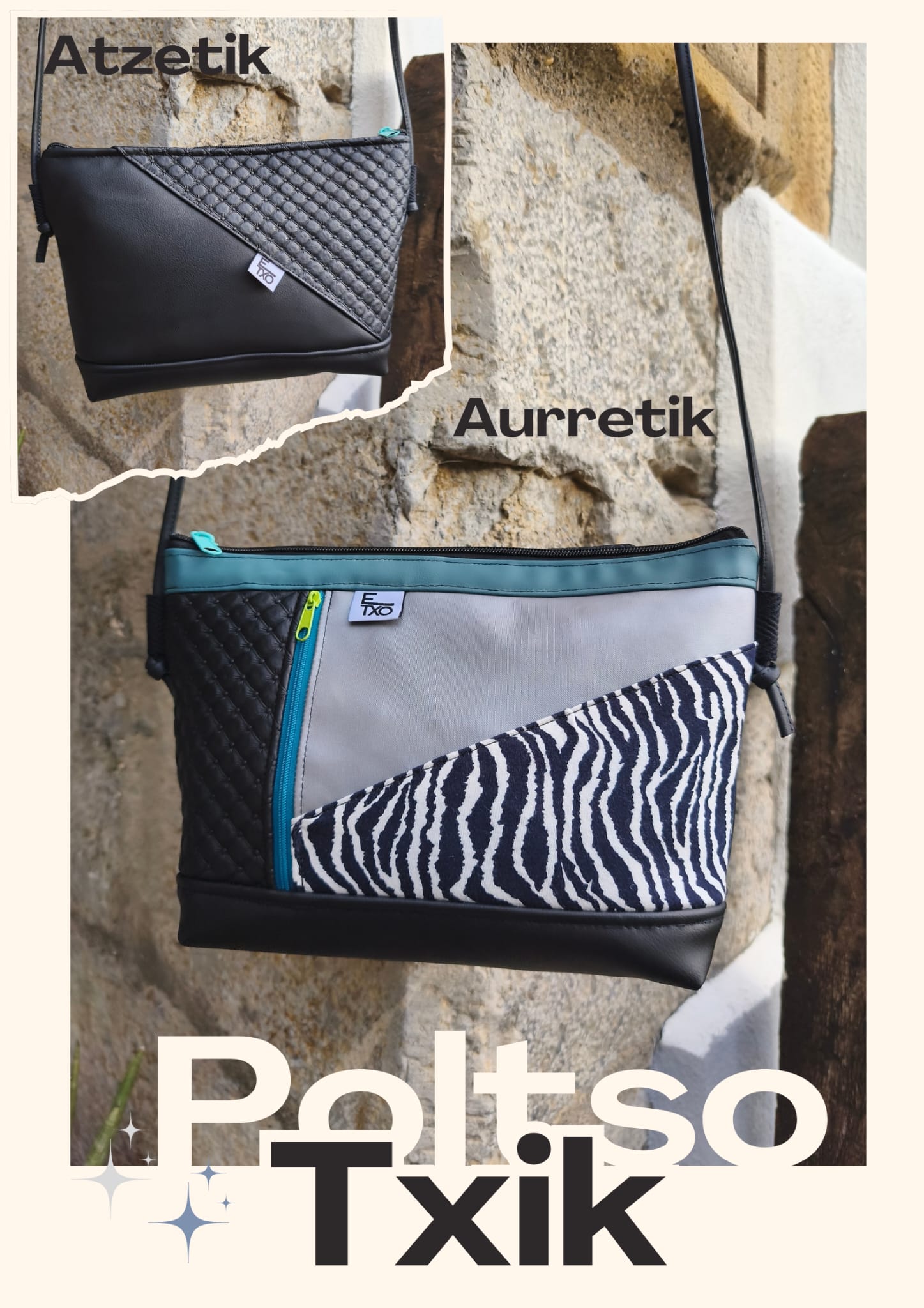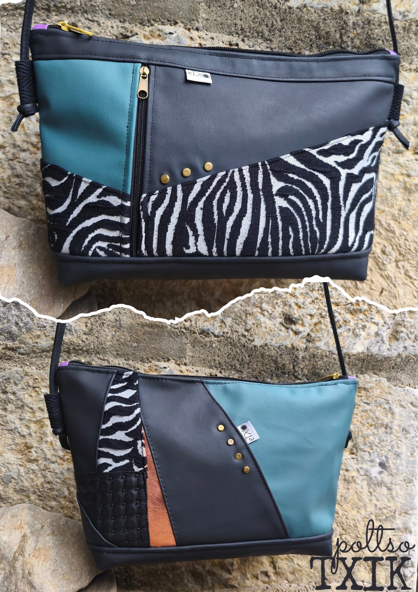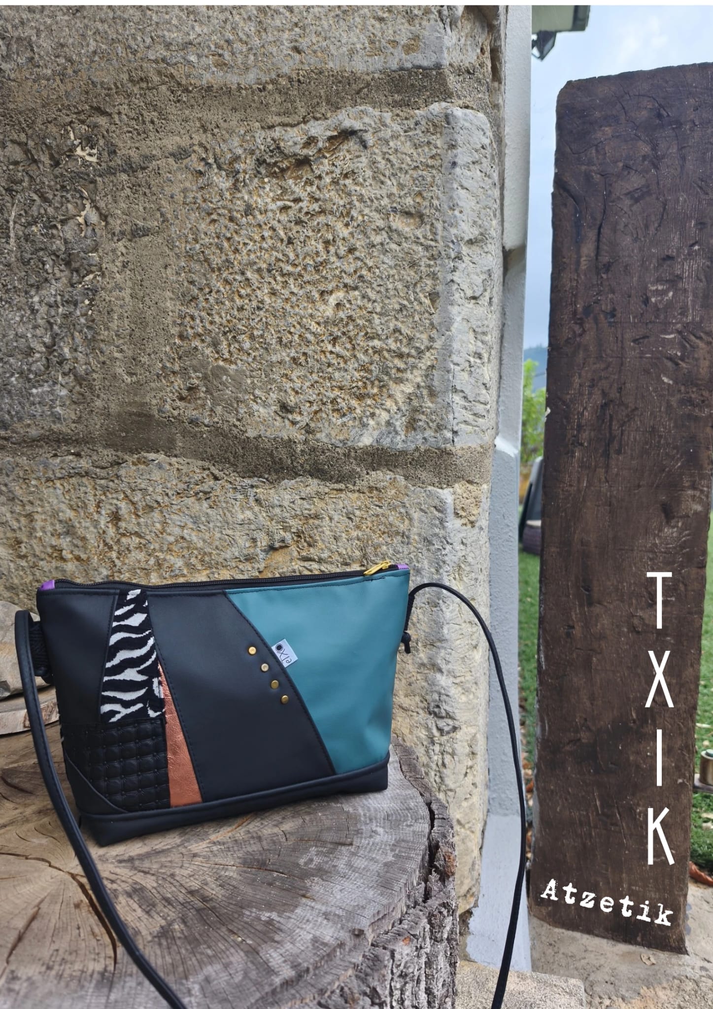 Eskuz eginiko larruantzezko poltsoa, lona, kotoi edo tapizatzeko telekin konbinatua. Larruzko uhala eta kotoizko forroa / Bolso hecho a mano de polipiel con mezcla de telas de tapicería, lona, algodon… Correa de cuero y forro de algodón.