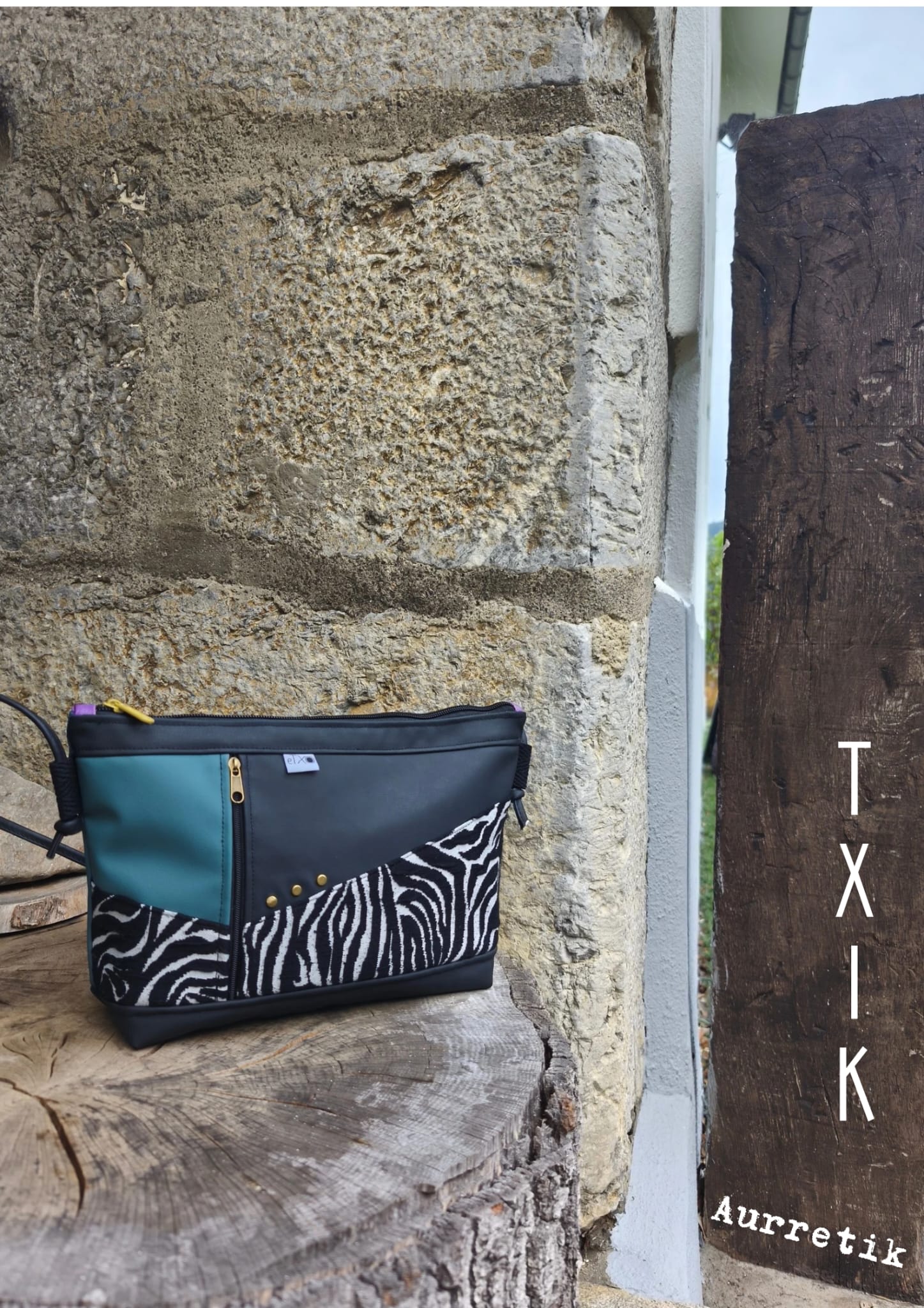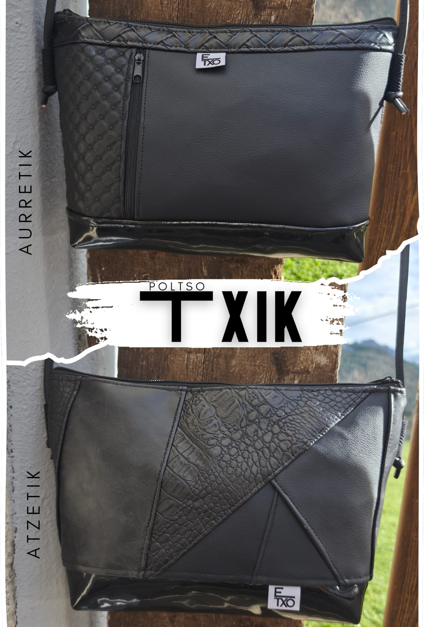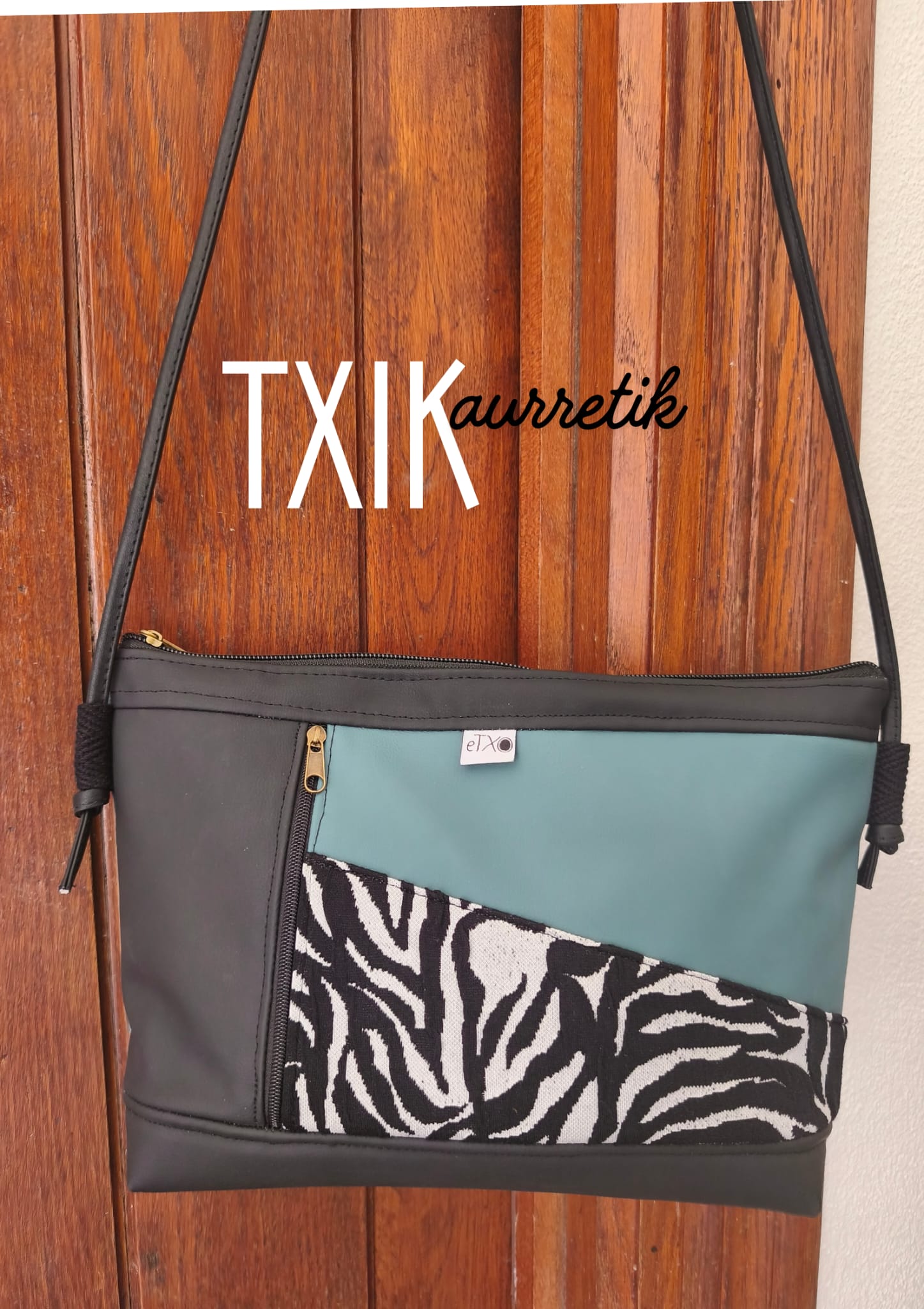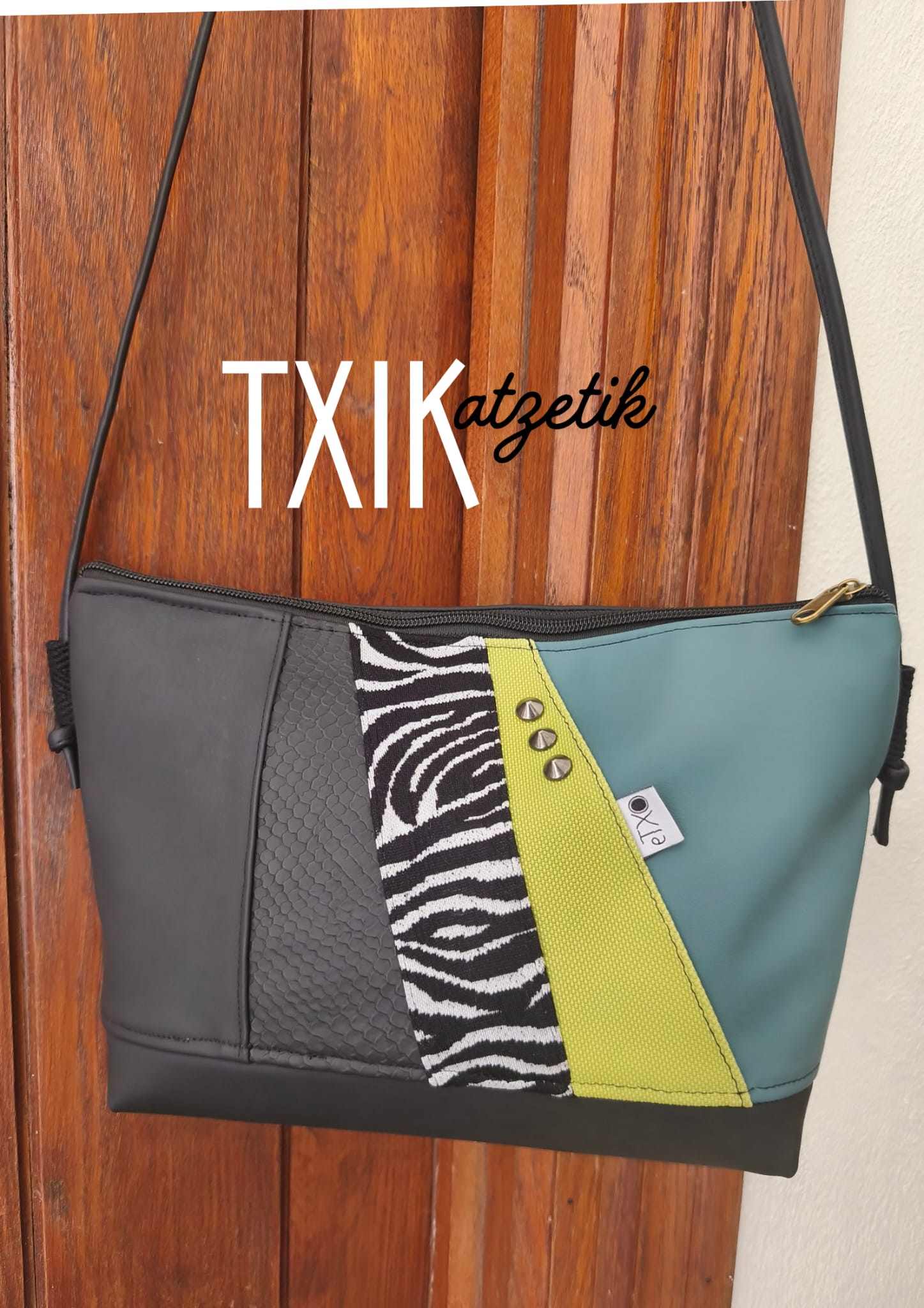 Eskuz eginiko larruantzezko poltsoa, lona, kotoi edo tapizatzeko telekin konbinatua. Larruzko uhala eta kotoizko forroa / Bolso hecho a mano de polipiel con mezcla de telas de tapicería, lona, algodon… Correa de cuero y forro de algodón.