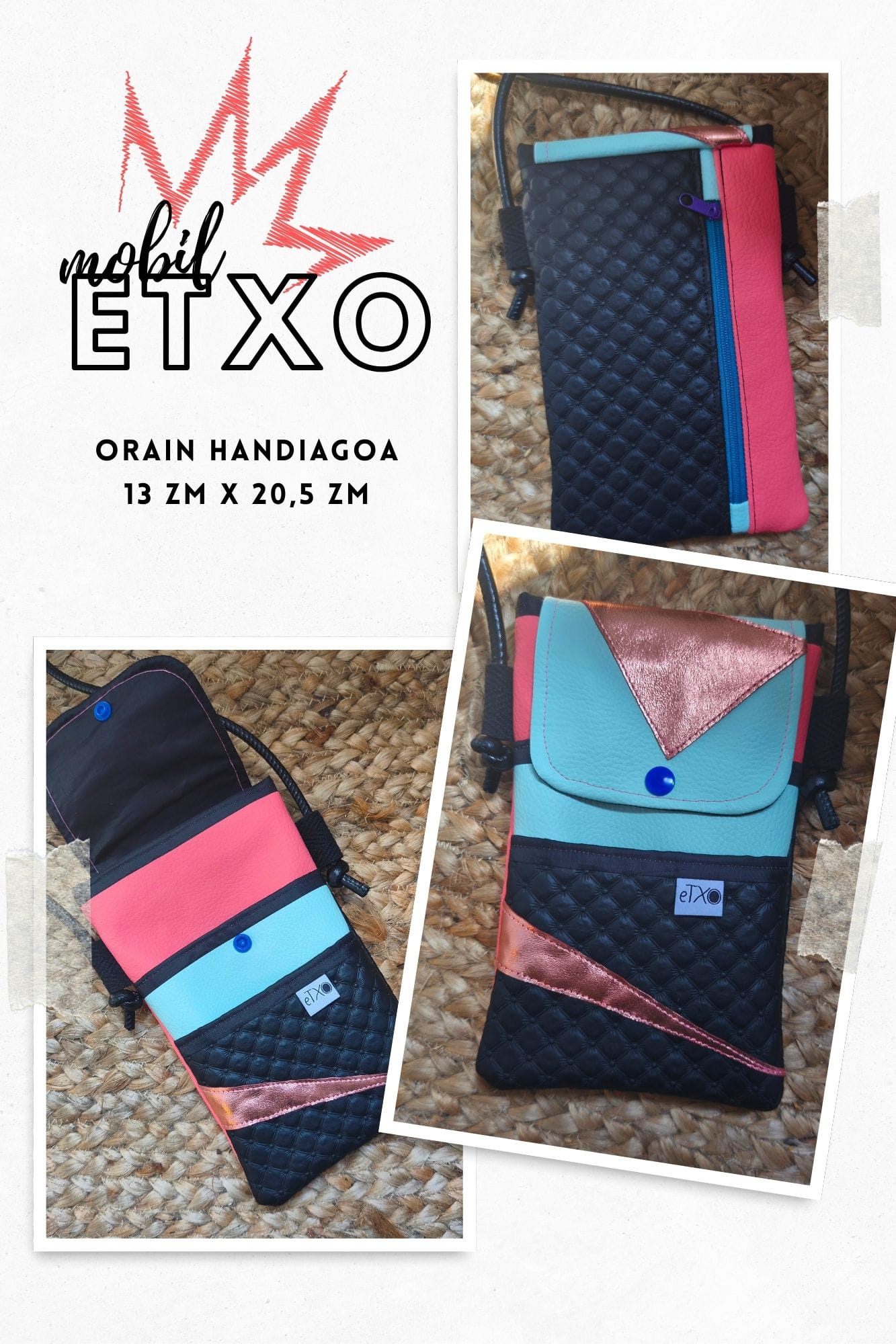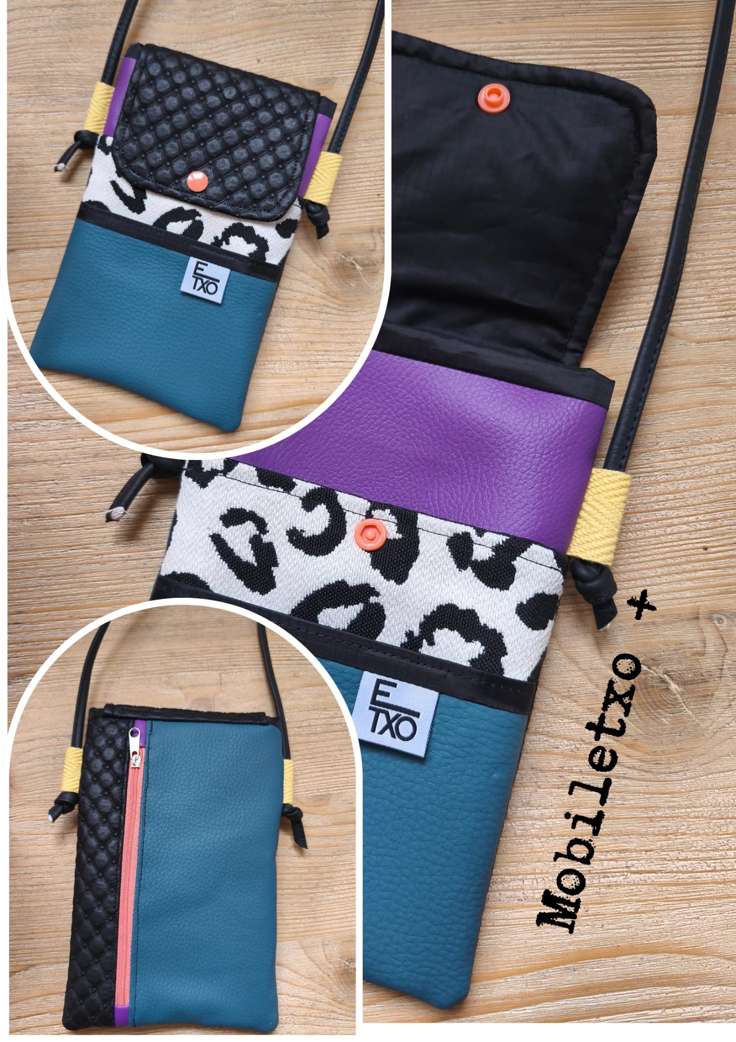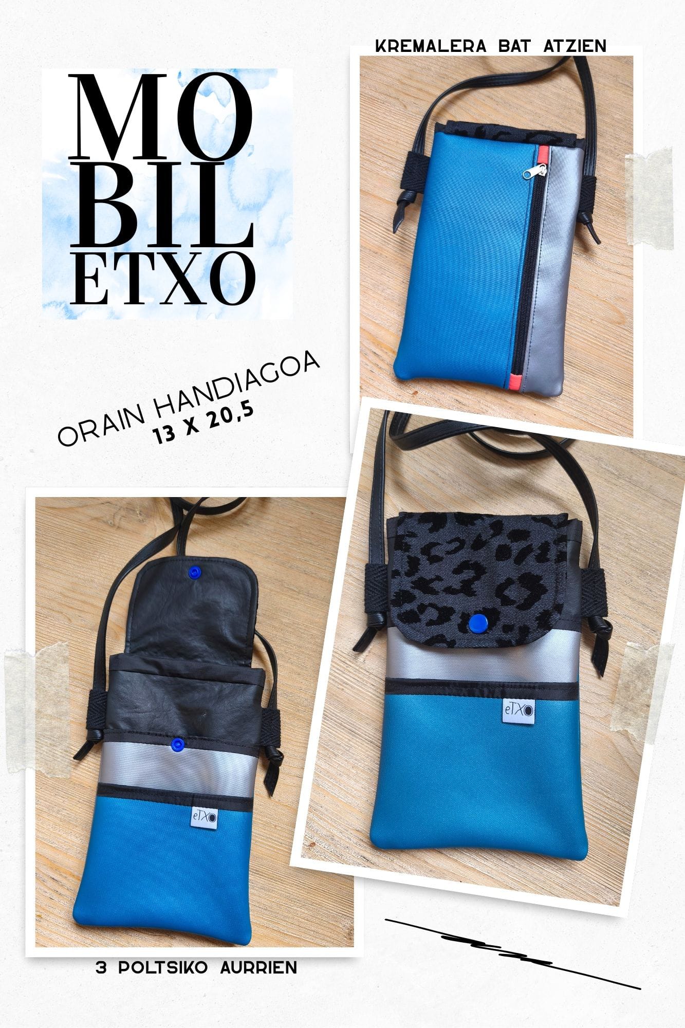 Eskuz eginiko larruantzezko poltso txikia mobila eramateko aproposa. Bi poltsikorekin. Larruzko uhala / Bolso pequeño hecho a mano de polipiel combinable con telas de tapicería, lona, algodon… ideal para llevar el movil. Dos bolsillos independientes. Correa de cuero.
