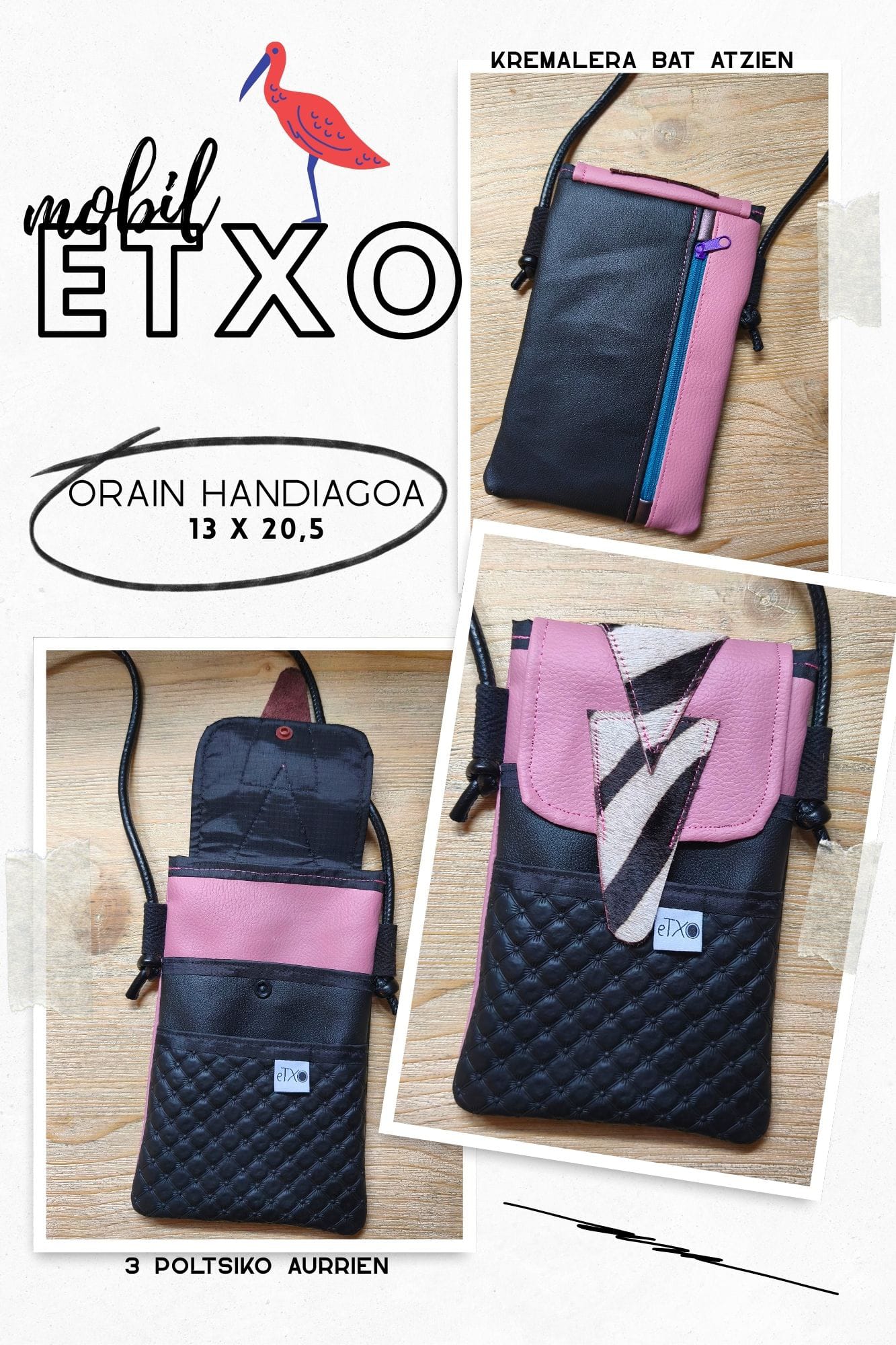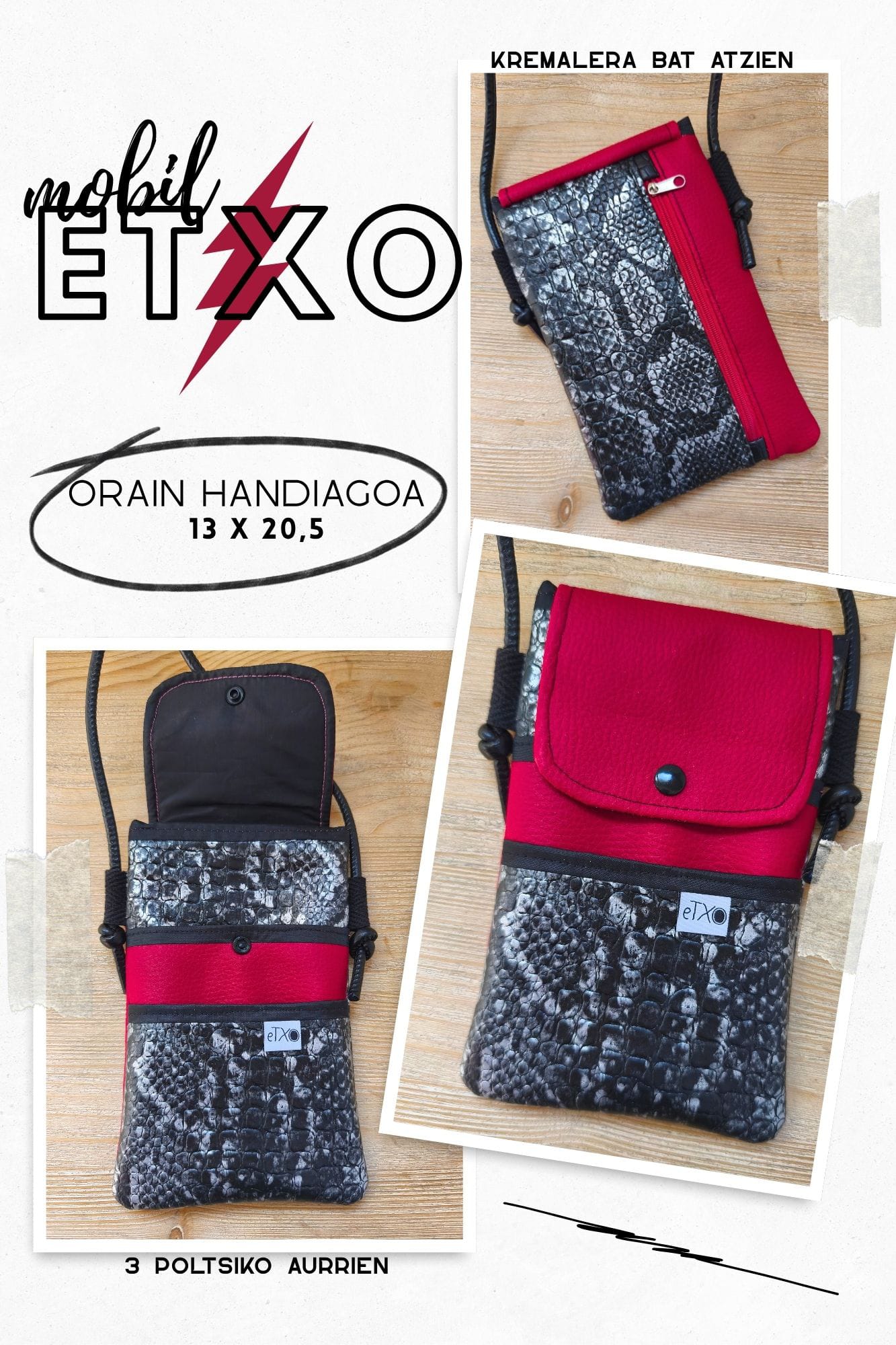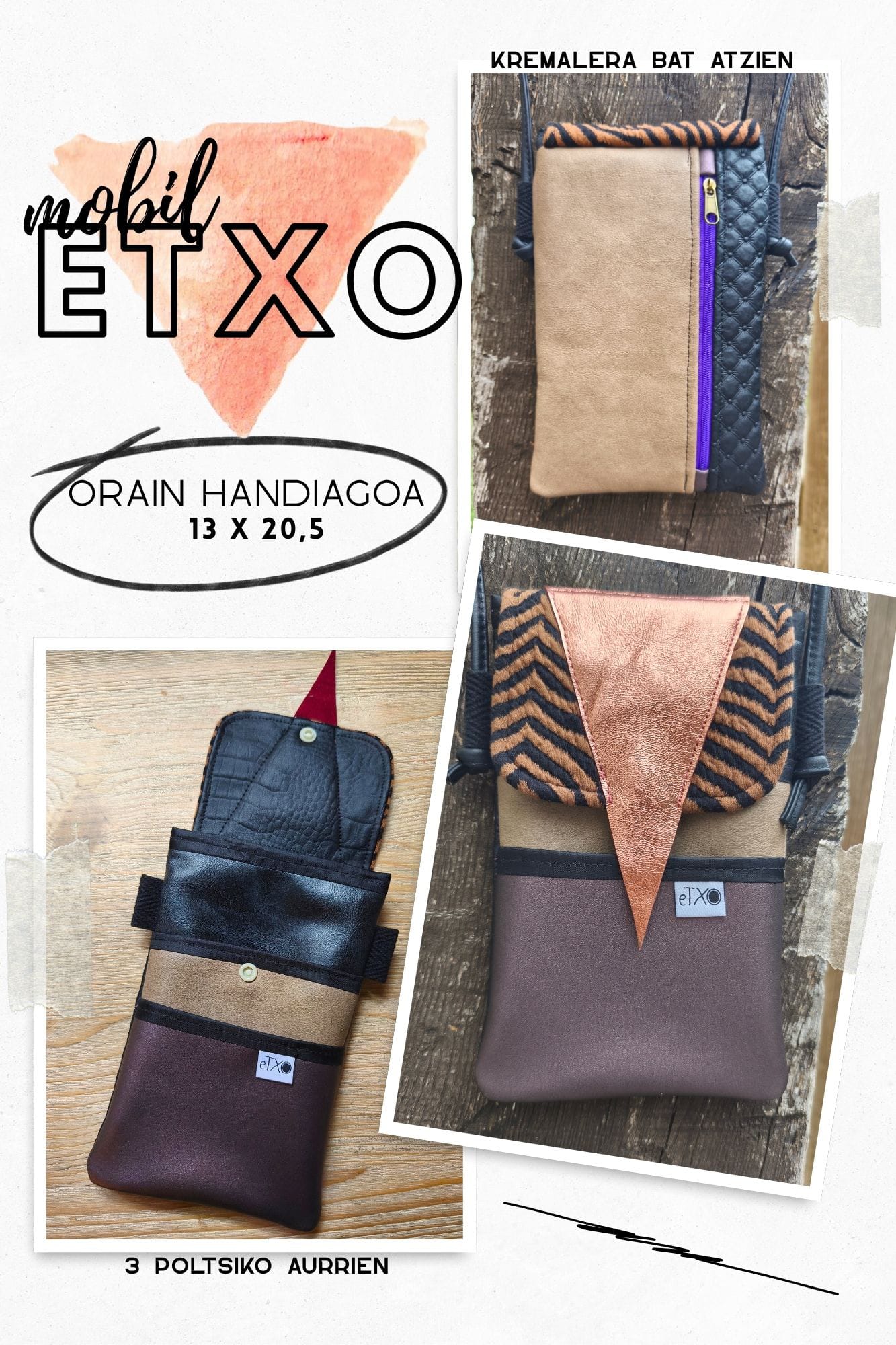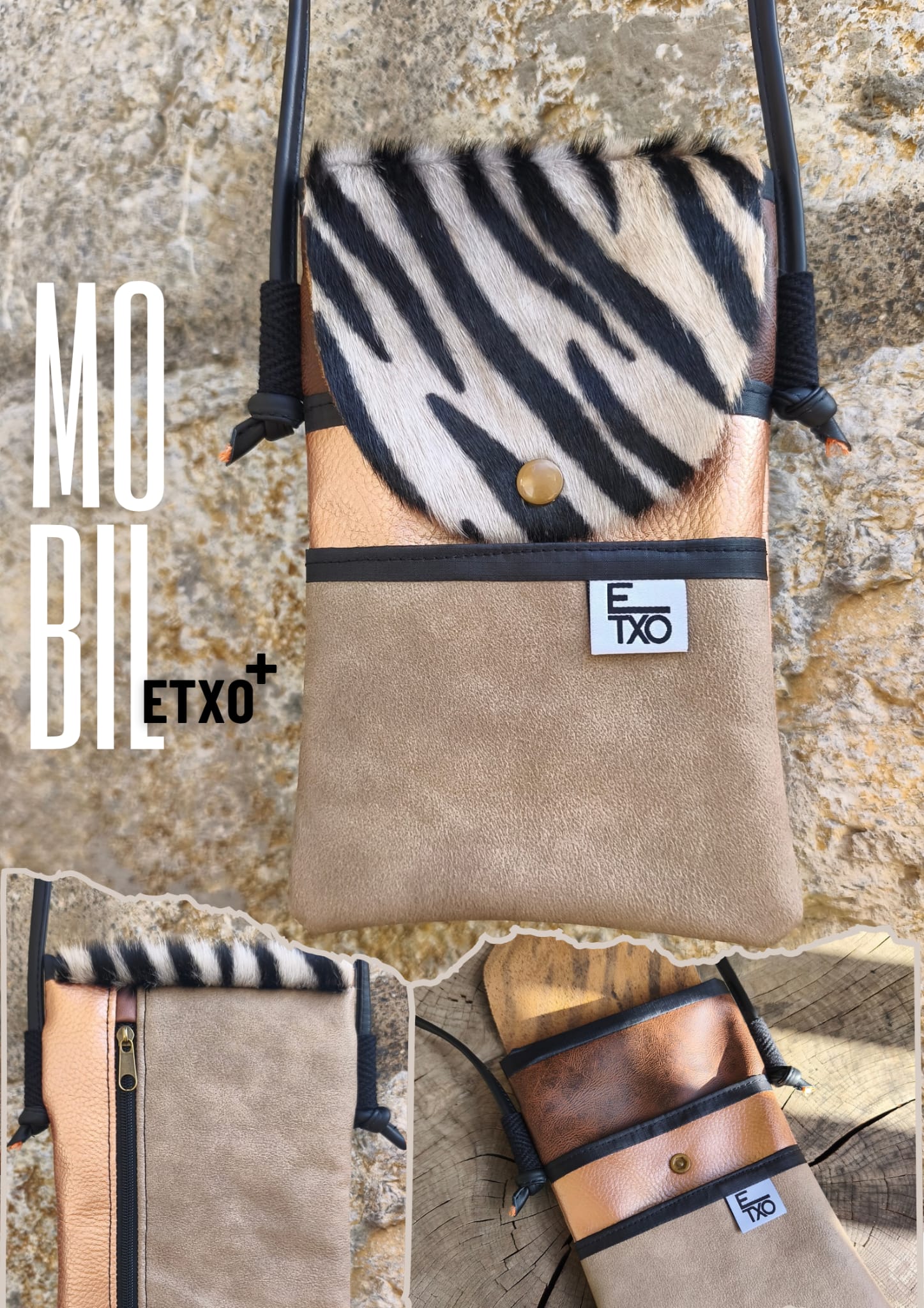 Eskuz eginiko larruantzezko poltso txikia mobila eramateko aproposa. Bi poltsikorekin. Larruzko uhala / Bolso pequeño hecho a mano de polipiel combinable con telas de tapicería, lona, algodon… ideal para llevar el movil. Dos bolsillos independientes. Correa de cuero.